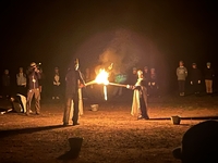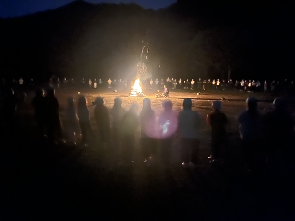 お待たせしました!舘岩一挙更新です。初日、今回のメインイベントの1つ、キャンプファイヤーが行われました。第1部は厳粛な雰囲気の中、火の神から5つの聖なる「平和」「協力」「希望」「元気」「団結」の5つの火を火の子たちに与えられました。中心に火が燃え盛る中、マイムマイムに始まり、爆弾ゲーム、じゃんけん列車、ジンギスカンと大盛り上がりでした。実行委員の子どもたちは「最高だった!」「もう1回やりたい!」と達成感に包まれていました。