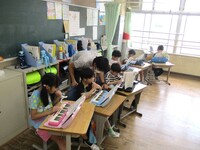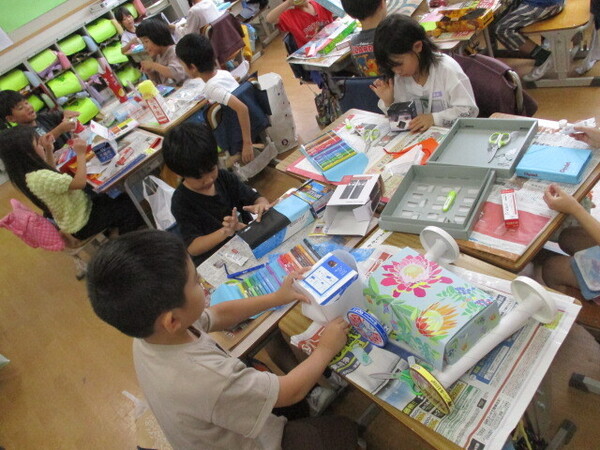 3年生はこれまで、学校の教職員にどのような仕事をしているのかをインタビューし、それを文章にまとめてきました。そのお礼の手紙を持って職員室に「〇〇先生いらっしゃますか?」と訪れます。みんなが書いたお手紙もとても上手に書けていましたよ。1年生は何やらいろいろな箱で何かを作っています。その箱の模様や形を生かし、かざりつけをして別のものに生まれ変わらせています。いろいろなアイデアが満載の作品になっています。にじいろさんから鍵盤ハーモニカの音が聞こえます。低学年の子どもたちです。先生に教わりながら一生懸命に練習していました。もっと上手になれるといいですね。