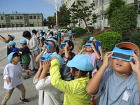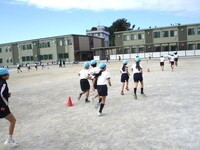 10月10日は最初の東京オリンピックの開会式の日です。少し前までは「体育の日」でした。そんな今日は秋晴れです。校庭で体育をしていたのは4年生と3年生でした。4年生は持久走を行っています。大切なことは同じペースで長く走ることですね。先生の「あと1分!」の声を聞くと「よっしゃー!」と自分に気合いを入れなおす子がいました。たくましいです。3年生は鉄棒をしています。ふとんほしから卵まわりへ。勢いを回転にどうつなげていくかが鍵です。連続で10回以上回る強者もいました。すごい!ふと横を見てみると、3年生が目に何かを付けて空を見上げています。理科の授業で太陽の勉強をしているのでしょう。遮光グラスで太陽を見ると「太陽が赤くなっている!」丸い形がはっきり見えて子どもたちもうれしそうでした。