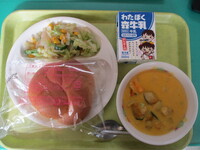 日に日に寒く感じる日が増えてきました。木々の葉も落ち始めています。そんな中、朝の時間に2・4・6年生のクリーン活動が行われました。校庭の周りの草や落ち葉、校庭内の石ころなどを一生懸命に拾っています。「先生、見て見て!」といっぱいになった袋を担任の先生に見せています。みんなありがとうね。さて今日はお話給食でした。読書月間の取組の一つで、以前に図書委員会の子どもたちが呼んでくれた「かぼちゃのスープ」にちなんだメニューです。ごろごろと入ったかぼちゃとそのスープは甘みがありとてもおいしかったですね。ぜひ本も読んでほしいです。