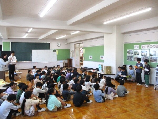 2年生は生活科で動くおもちゃづくりをしています。そのまとめとして、作ったおもちゃで1年生と一緒に遊ぶ交流活動を行いました。2年生は視聴覚室で準備をし1年生を迎えます。初めの会で遊び方や回り方の説明を聞いてスタートです。6つのグループに分かれ、2年生が1年生に遊び方を教えたり、うまくできた子に拍手をしたりと、上級生として優しくかかわってくれます。1年生もいろいろな遊びができてとても楽しそうです。1年生は今後、幼稚園や保育園の子どもたちを迎えることがありますので今日のことが役立ちそうですね。