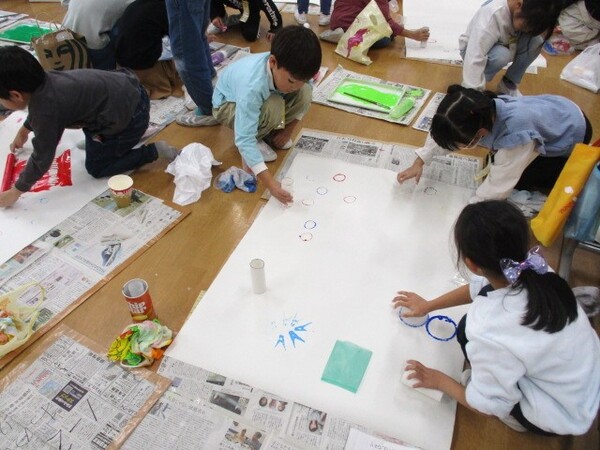 今日は11月11日…ということで、1年生の授業を見学しました。机を下げて何やら図工の活動が始まりそうです。先生の合図でインクの場所に集まると持っているいろいろなものをインクに付け始めました。トイレットペーパーの芯やプリンの器、洗濯ばさみやプチプチなどに色をつけて、それを大きな模造紙にスタンプしています。たくさんつけたり、重ねたりとみんなで工夫しながら楽しそうに活動しています。別のクラスではタブレットを広げています。もう扱えるようになっているのですね。「やったできた!」「私が教えようか?」いろいろな声が聞こえてきます。先生が「teams開いてね」というともうすでに理解している様子。大したものです。今日は学校評価のアンケートに取り組みました。保護者の皆様も恐れ入りますがご協力お願いします。