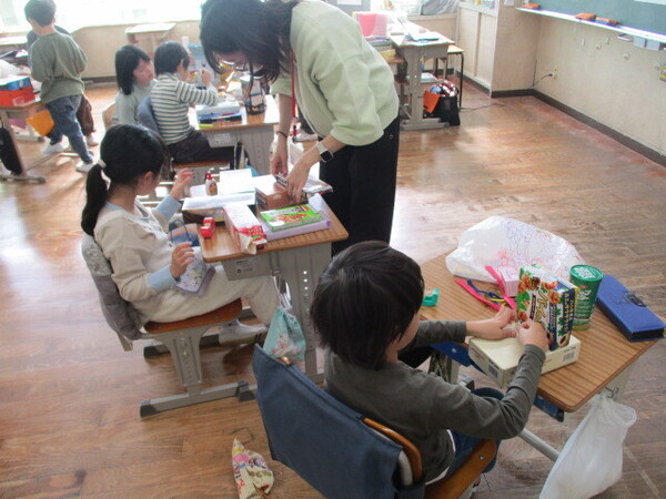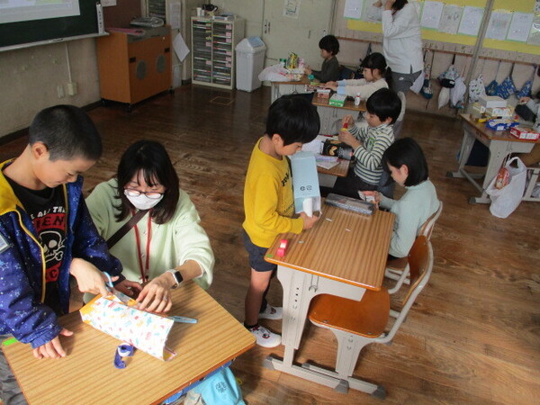11月17日(月) にじいろは箱を使って工作をしています。4年生は人生初めての彫刻刀です。
