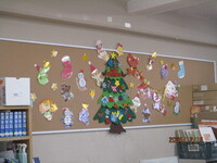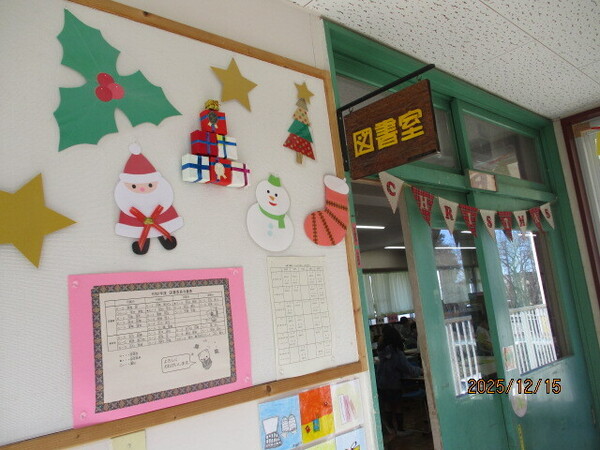 2学期もあと8日となりました。図書室に行くと2年生の子どもたちがじっくりと読書を楽しんでいます。図書室の中をじっくりと眺めると、いろいろなクリスマスを見つけることができました。壁にはクリスマスツリーやトナカイ、長靴などの掲示物がたくさん貼られていました。図書室の入り口にもいろいろな飾りがついていますね。また、図書室の一角には、サンタクロースに関わる本の紹介もあります。こうやって図書館司書の先生や図書員の子どもたちが、季節や行事に合わせて、本を楽しんでもらえるよう工夫しているのですね。冬休みも時間がたくさんあると思うので、いろいろな本に出合えるといいですね。