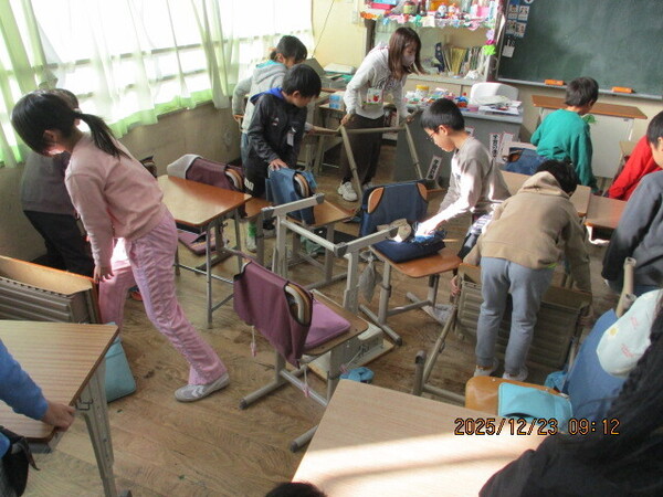 2学期もあと2日となりました。今日も学習内容が終わった学級がみんなで考えたレクをしています。明後日はクリスマス・イブということもあり、今日はサンタの帽子やトナカイの角が目立ちました。校庭では3年生がだるまさんが転んだならぬ、「サンタさんが転んだ」が行われ、その後「プレゼント運び」を楽しんでいます。4年生でも、プレゼントまわしでしょうか。にぎやかな声が響いてきます。明日で2学期が終わりということもあり、多くの学級で「大掃除」も行われています。机やいすの足の裏についたほこりをとったり、普段あまり掃除しない棚の中を拭いたりと、きれいにしてくれました。みんなありがとう!明日は終業式です。早く寝て明日に備えましょう。