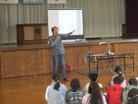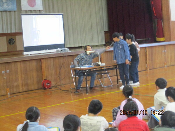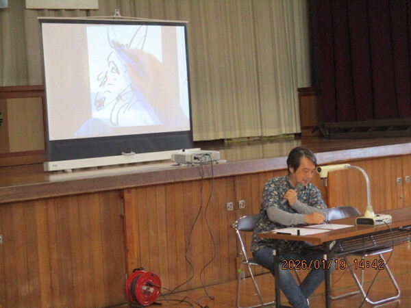 今日は未来くる先生が来校されました。今年は、漫画家でイラストレーターでもある、あらい太朗さんに来ていただきました。別の顔もあり、NACK5で朝の6:00~9:00まで放送している「Good Luck!Morning」のコメンテーターであるアロハ太朗さんでもあります。今日もラジオの後にそのまま来ていただいたのでアロハシャツを着ています。イラストを描くのもラジオで話すのも違う仕事のように見えて、喜怒哀楽の感情を表現するということでは同じだと話します。子どもたちもあらいさんからの簡単な指示を受けて、イラストを描きましたが、一人ひとりがどんな想像をするのかに違いがあることがよくわかりました。好きなことを仕事にできる幸せが伝わってくるお話でした。最後にリクエストで「オオカミを描いてください」と言われ、「オオカミ?描けるかなあ…」といって、さらさらとイラストが完成!その出来栄えに大きな拍手が起きました。あらい太朗さん今日はありがとうございました。