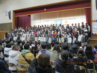 「巣立ちの会」あと1か月で卒業する6年生が最後の授業参観を迎えました。たくさんの保護者の皆様が体育館に集まりました。「僕らまた」のリコーダー合奏からスタートし、劇のスタートです。1年生から6年生までの成長を各クラス、担当が楽しく劇にしたり、踊ったりしながら振り返りました。本当に6年間いろいろなことがありましたね…。一人一人が将来の夢を大きな声で述べます。ゲームクリエーター、かっこいい大人、科学者、警察官…どんな大人になるのでしょうか。最後は、この1年間、6年生のテーマでもあった曲「友~旅立ちの時~」を全員で合唱しました。素晴らしい歌声をありがとう。あと1か月、後悔のないよう友達や先生といい時間を過ごしてください。参観していただいた保護者の皆様ありがとうございました。明日から3連休、インフルエンザには十分お気を付けください。
