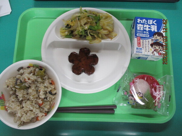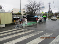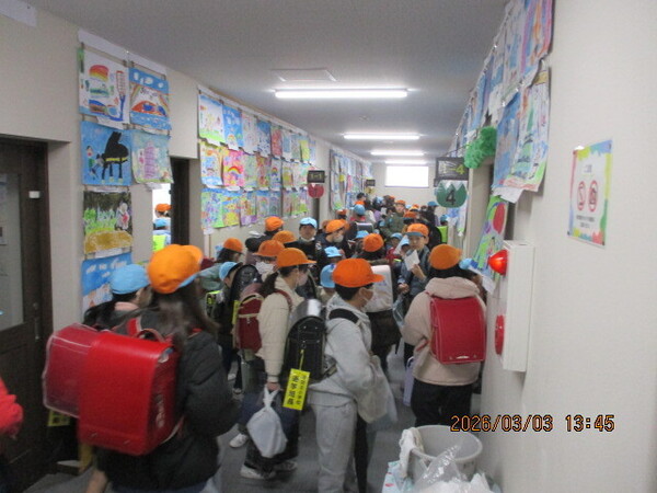 今日は朝から冷たい雨です。今年度最後の一斉下校が行われました。これまで班の子どもたちを責任をもって導いてくれた班長・副班長さんが今日で終わりとなります。優しく声をかけたり、手をつないだりして安全に連れて来てくれました。どうもありがとう。そして、明日から新しい班長・副班長の出番です。皆さんよろしくお願いします。担当の先生と一緒に班長・副班長をみんなで労い、注意点を聞いて下校しました。保護者の皆様も引き続き見守りをよろしくお願いします。今日は3月3日ひな祭り。給食もちらしずし、お花のハンバーグ、さくらもちと子どもたちが大好きなメニューです。ごちそうさまでした。
