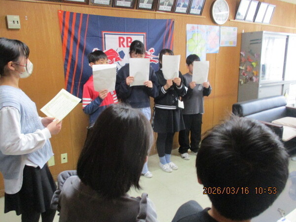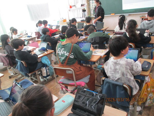 今日は図書委員会主催による図書の表彰が校長室で行われました。今年、図書室で一番本を借りたのは、3年児童の126冊、6年間で最も多かった子は506冊です。すごい数です。図書委員会の皆さんが進行を務め、校長先生から表彰状を受け取りました。これからも素敵な本当の出会いがあるといいですね。さて、4年生が何やら真剣にタブレットを見ています…がよく見るとこれまでと光景が少し違うような。どうやら初めて「iPad」に触れたようです。画面が付くと「わあ~きれい~」「押しやすい!」など感想もさまざまです。このiPadは前回よりも壊れにくくはなってますが、それでも繊細な機械ですから皆さん大切に使ってくださいね。これでたくさん勉強しましょう。