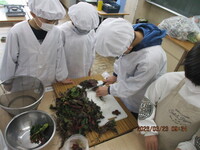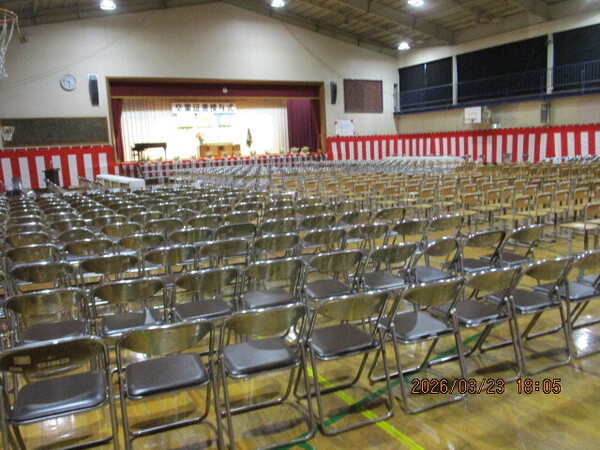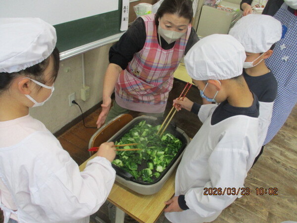 いよいよ令和7年度も最後の週となりました。3校時は5年生が、明日の卒業式に向けて校内の清掃をしてくれました。きれいにしてくれてどうもありがとう。にじいろの子どもたちは育てた野菜で調理実習を行いました。白菜のバター醤油炒めや漬物、白菜・かぶ・ビーツのスープ、小松菜のごま味噌和えなど、メニューも様々です。調理の様子を見ると、さすがは6年生、手際よく野菜を切っています。どれもおいしくできてよかったですね。午後は、先生たちで卒業式の準備を行いました。会場は整いました。明日は天気もよさそうです。6年生の皆さん、待っています。今日は早く寝てください。保護者の皆様もどうぞよろしくお願いします。