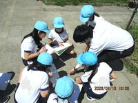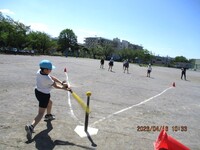今日は朝から晴れ、久しぶりな気がします。校庭から元気な声が響いてきます。5年生の体育は「ティーボール」です。「行くぞー!」ティーに載せられたボールを思いっきりプラスチックバットでたたきます。止まっているのに意外に当たらないティーボール。学年の実態に応じてアウトにする方法は違います。5年生は、飛んできたボールを捕った人のところに全員が集まったら「アウト!」白熱したゲームが行われていました。4年生は校庭でへちまの種を観察しプリントに書き込んでいます。「先生、見てください」手のひらには真っ黒な種が。これがどのように育っていくか楽しみですね。